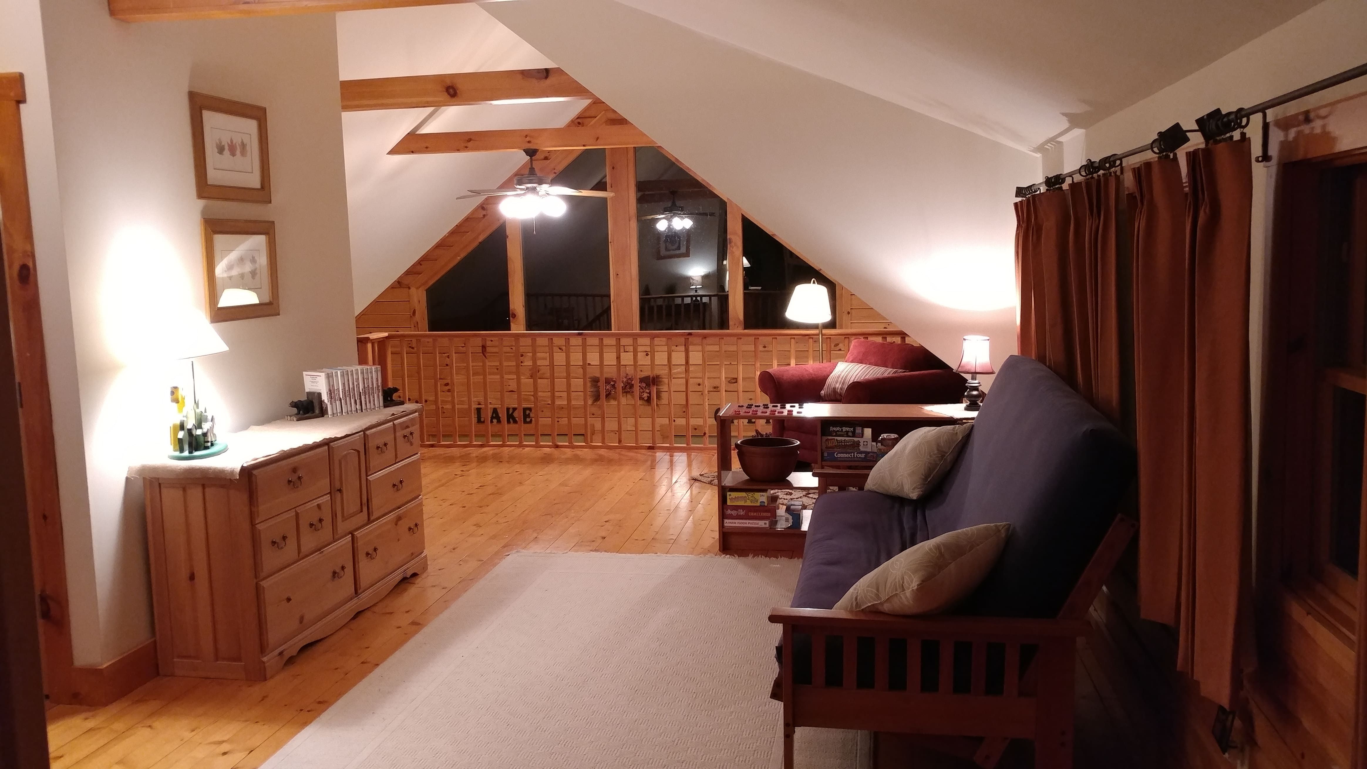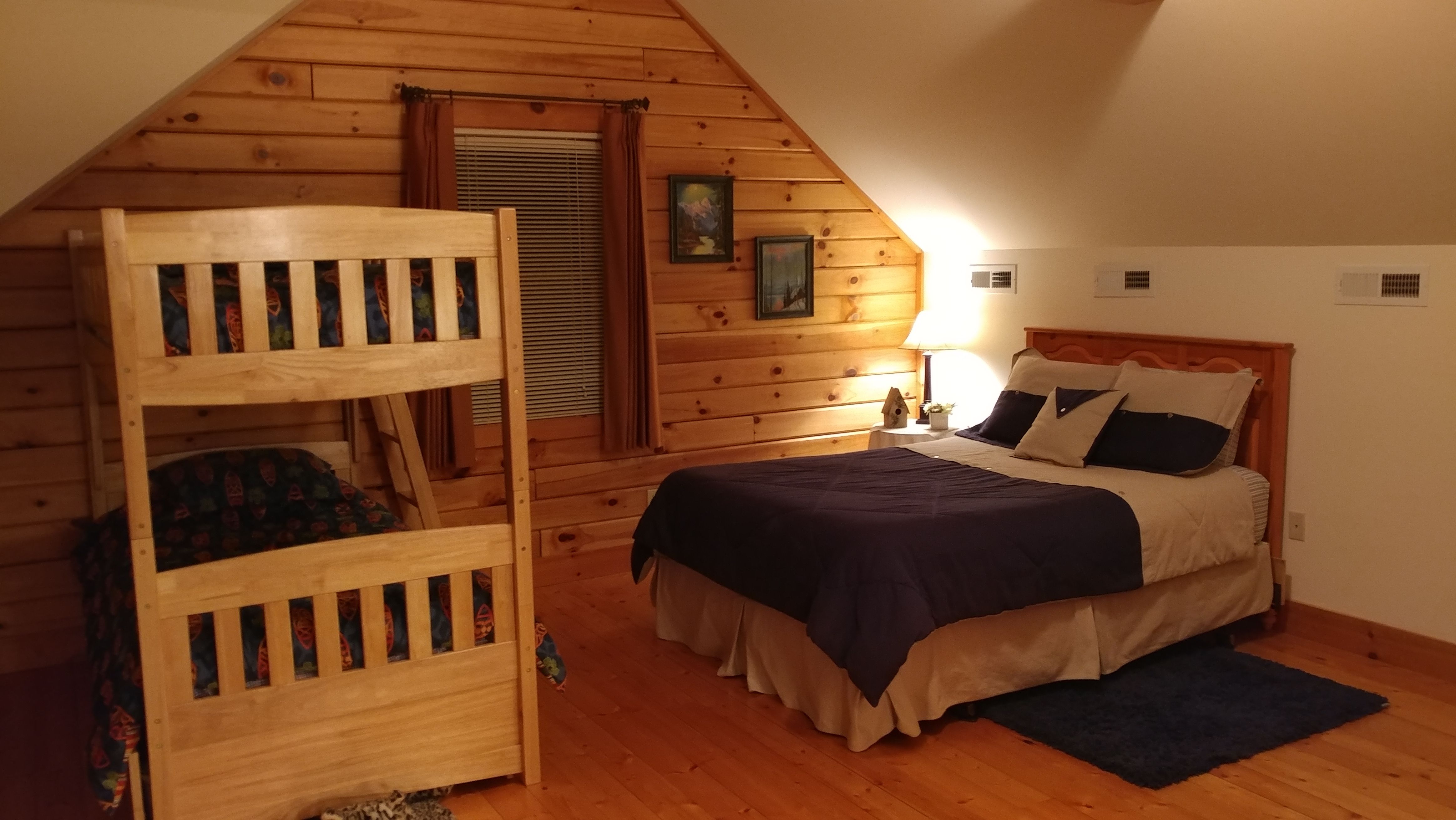 • Loft bedroom with queen bed, futon, bunkbeds, and bathroom with shower